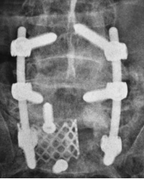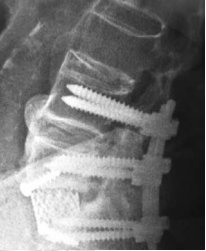 Mr O, an elderly man, was recently admitted for severe low back pain of two months duration. He had chronic low back pain on and off for many years. His pain this time was so severe that he could sit for only a short while. He could barely walk a few meters. The neurological examination was normal. X-ray of his lumbar spine revealed the feature of “’ bamboo spine’ typical of ankylosing spondylosis. There was a fracture through the ossified L5-S1 disc space which was widely opened. Flexion and extension x-ray showed there was considerable instability at the L5-S1 segment. Mr O underwent a two-stage surgery. The 1st stage was posterior L4 to S1 pedicle screw instrumentation. The 2nd stage anterior L5-S1 strut grafting with titanium mesh and fibular allografts was performed 5 days later. Post surgery, Mr O was relieved of his pain and was ambulating.