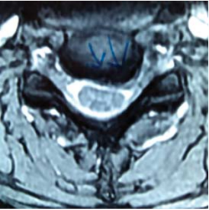 MRI showed severe prolapsed cervical disc indenting the spinal cord and neuroforamen’s of C5/6. There was evidence of spinal cord pressure with T2 changes seen on the sagittal views.