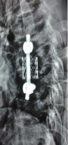 T7 corpectomy was done through a left sided thoracotomy. The resected vertebra was reconstructed using rib graft, a cage and a screw rods construct. Physical Findings