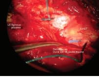 There was a large cyst at S1 and S2 communicating with the main dural sac via a narrow neck. The pressure in the cyst changes with filling of the cyst. Sacral nerves travel through the neck of the cyst to exist the sacral canal. As such, we decided on simple decompression of the S1 root and a laminectomy and not excision of the cyst which will require the sacrifice of sacral nerves passing through the neck and cyst.