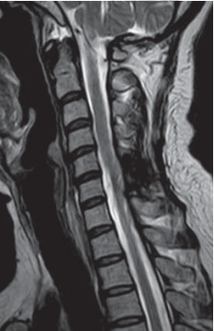 On examination, she was found to have a normal gait. Her tone and power was normal as well. Exaggerated reflexes in both her upper limbs were detected. Sensation to light touch was diminished over the right C5 and C6 dermatome and over the C5-C8 dermatome on the left. Pin prick and temperature sensation were similarly affected.