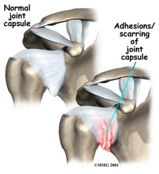 The common form of “frozen shoulder” we see in our practice is adhesive capsulitis. It is a syndrome defined as idiopathic painful restriction of shoulder movement that results in global restriction of the glenohumeral joint. This condition is characterized by gradually progressive, painful restriction of all joint motion with spontaneous restoration of partial or complete motion over months to years. It tends to occur in patients older than 40 years of age and most commonly in patients in their 50s and in women. Fifteen percent of patients develop bilateral disease.