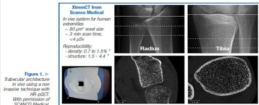 This type of machine measures cortical and trabecular volumetric bone mineral density (vBMD) at the distal radius and tibia in about 3 minutes at each site. The image definition can reach 82 mm in vivo, with excellent precision, as the coefficients of variation range from 0.7 to 1.5% for density variables and from 2.5% to 4.4% for architectural parameters (Figure 1) ^1.